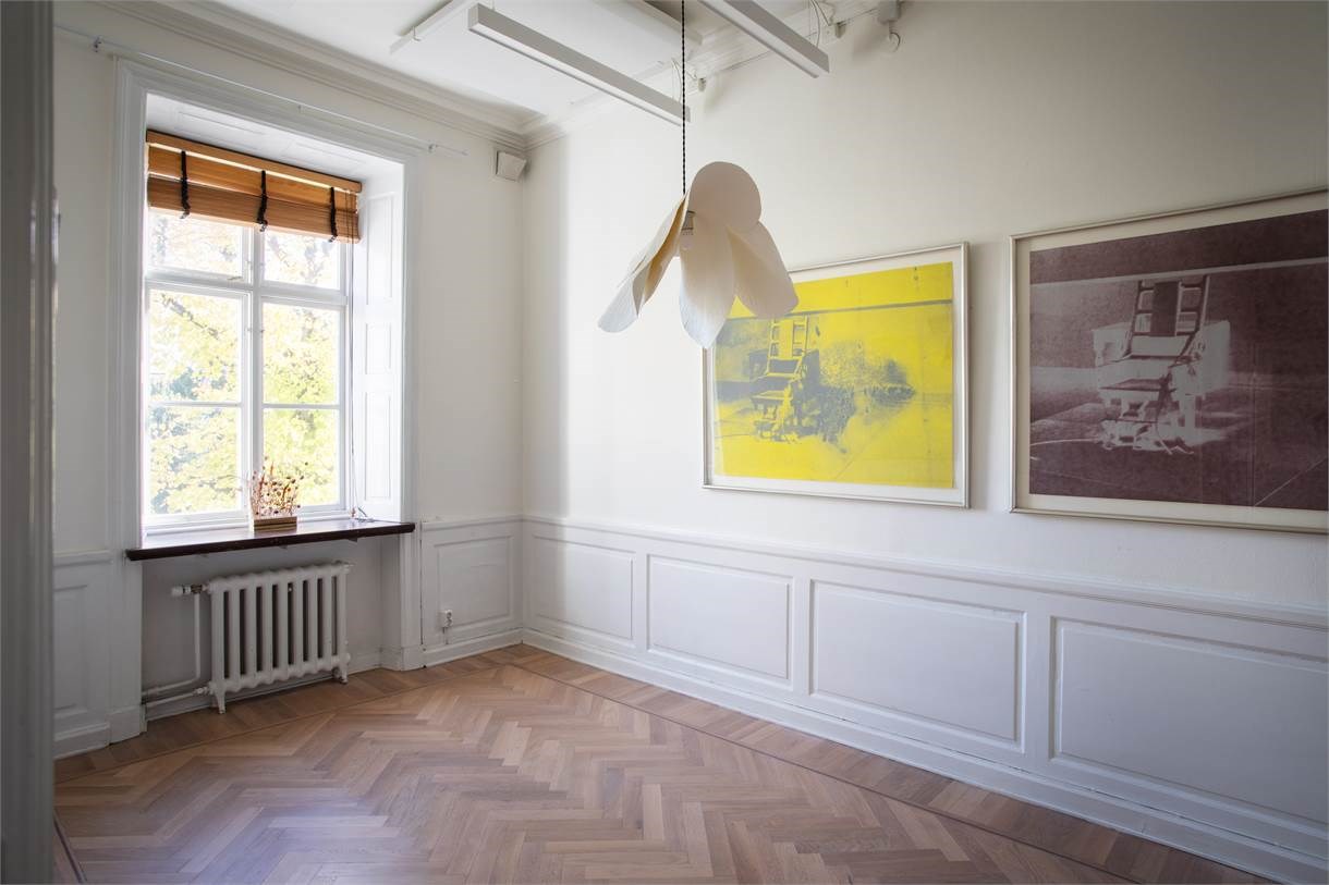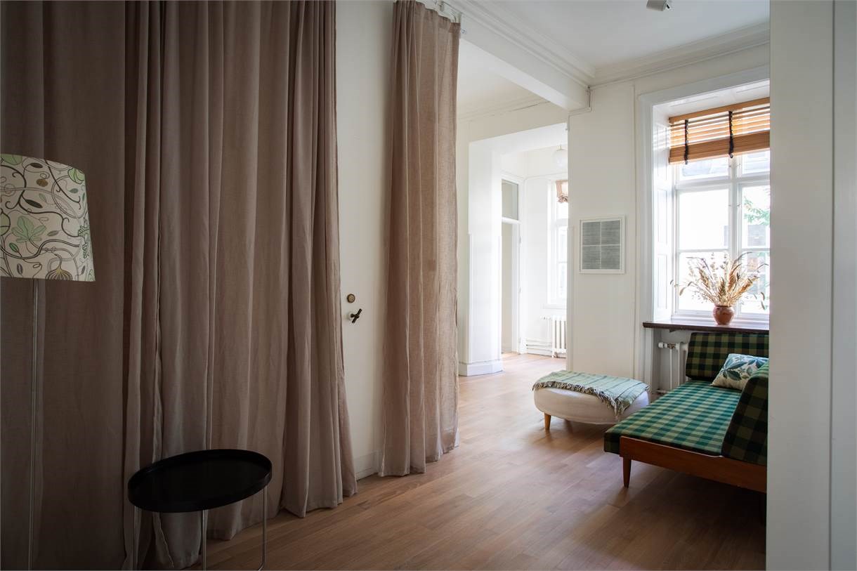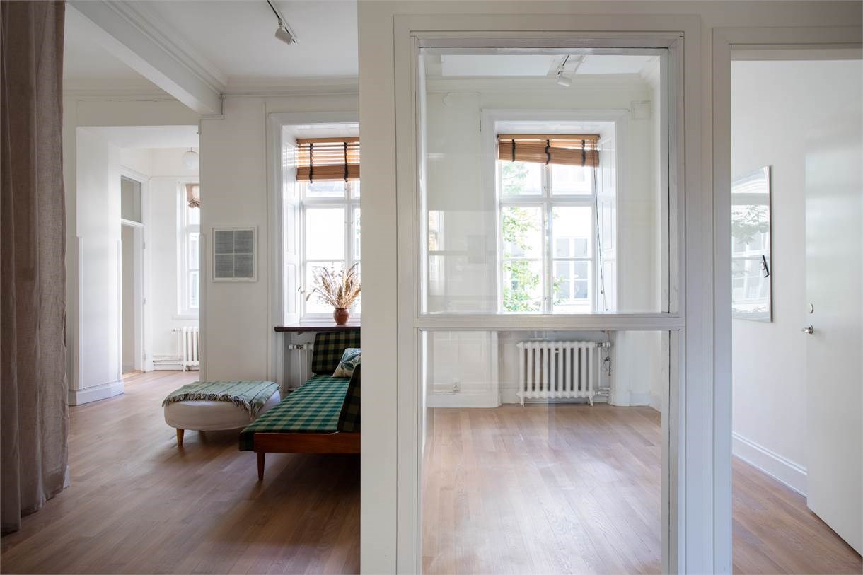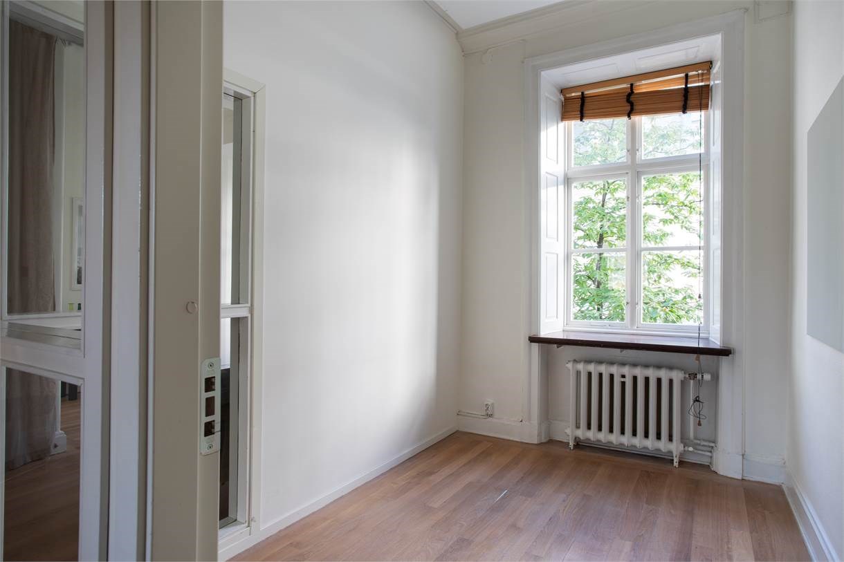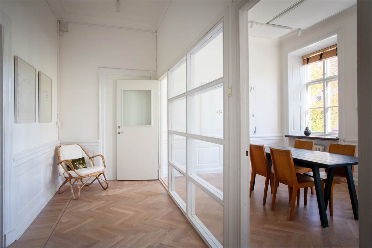 Här finns b.la höga fönster med djupa fönsternischer, stuckaturer, högt till tak, öppen spis, vackra bröstpaneler samt vacker fiskbensparkett som inger värme till lokalen.