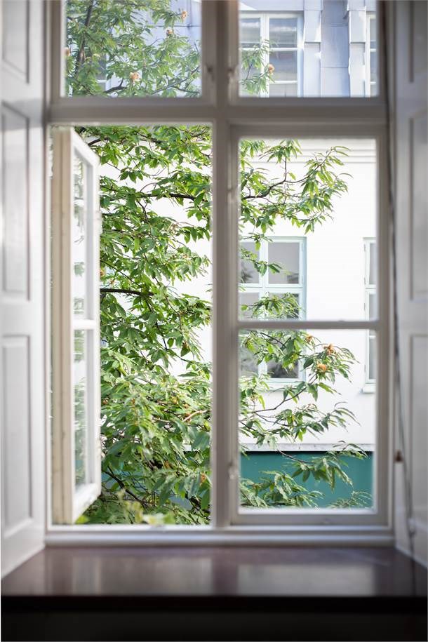 De stora, vackra fönstren släpper in rikligt med ljus och skapar en inbjudande miljö.