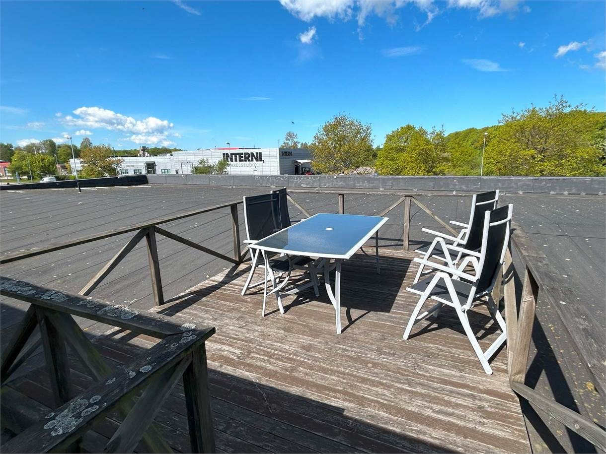 Fastigheten har en port på baksidan och erbjuder gott om parkeringsmöjligheter – upp till 30 platser – samt en inhägnad uppställningsyta på ca 500 kvm som delas med en annan hyresgäst.