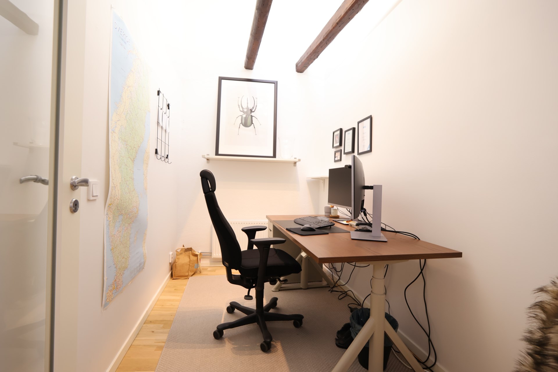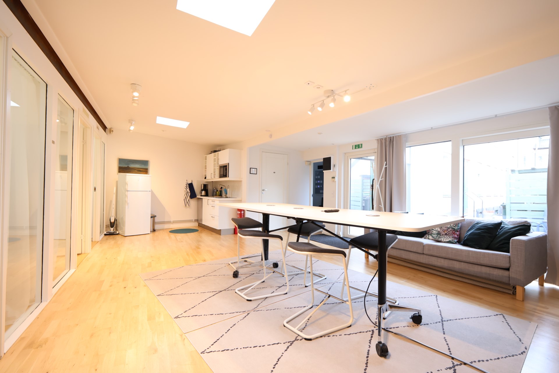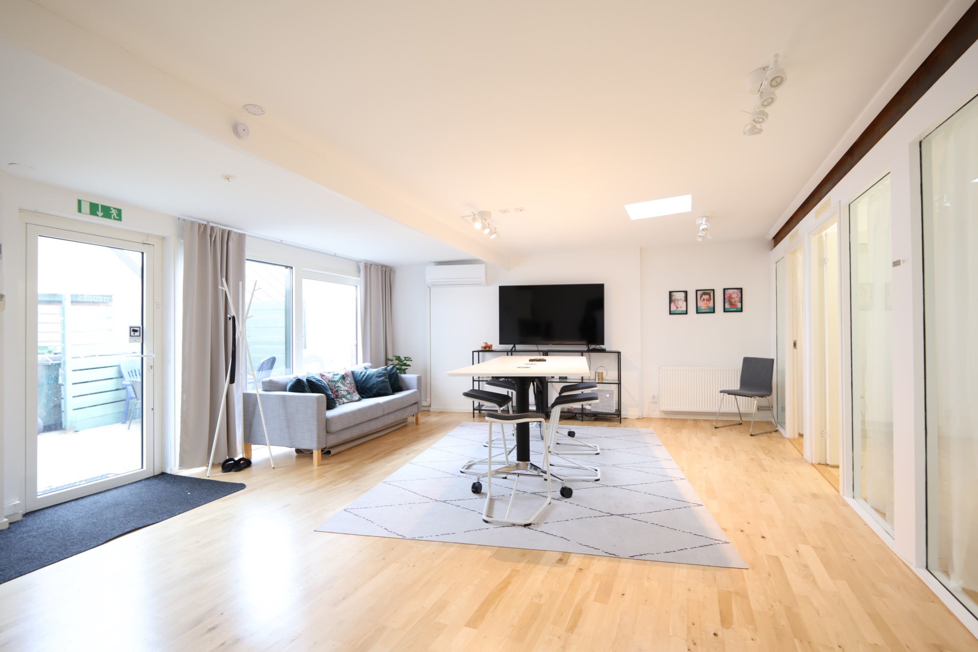 Lokalen består av tre kontorsrum, ett mötesrum samt en öppen yta som med fördel kan användas som kontorslandskap, gemensam arbetsyta eller större konferensyta. De stora fönstren vetter mot innergården och släpper in ett generöst dagsljus, vilket skapar en inspirerande arbetsmiljö.