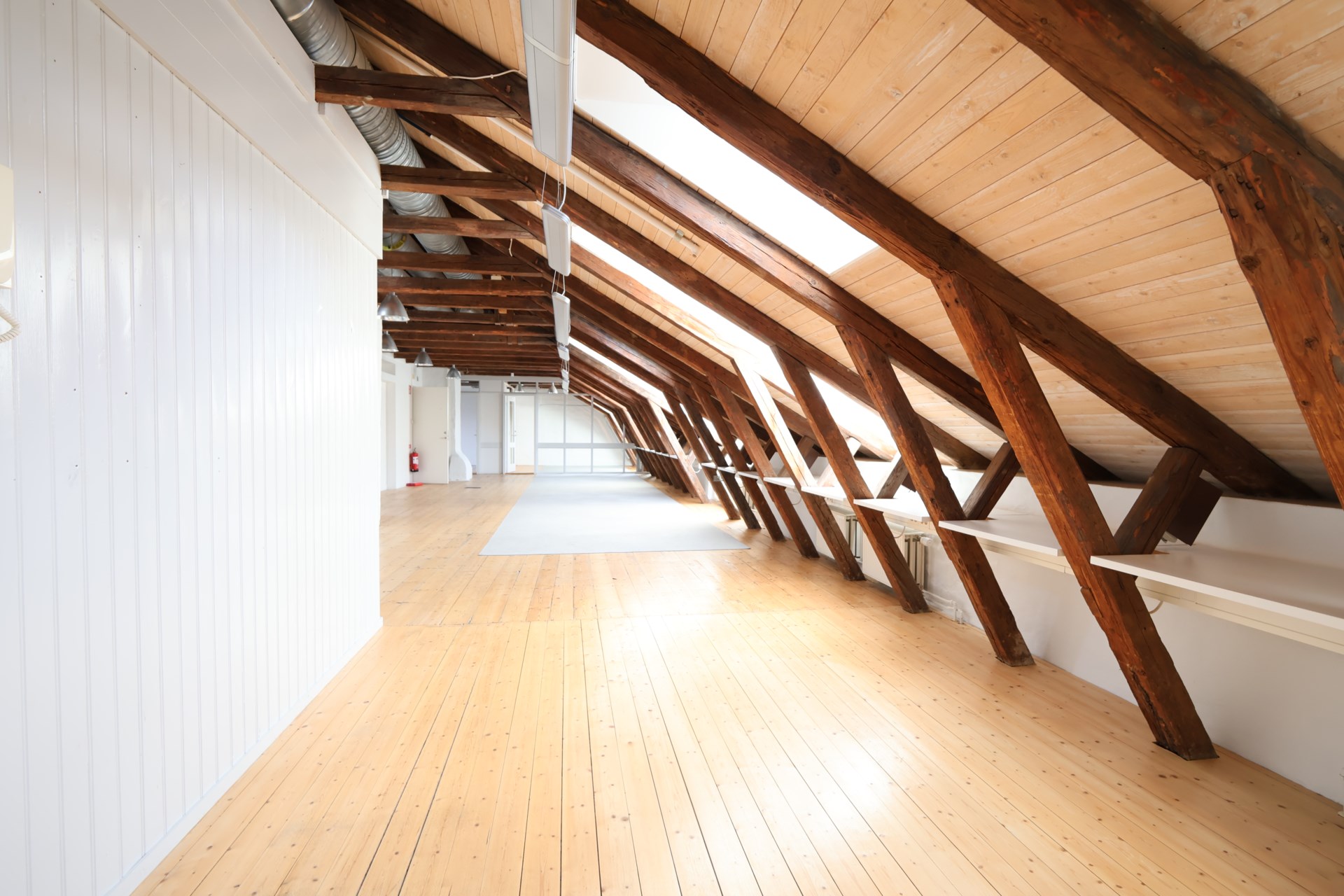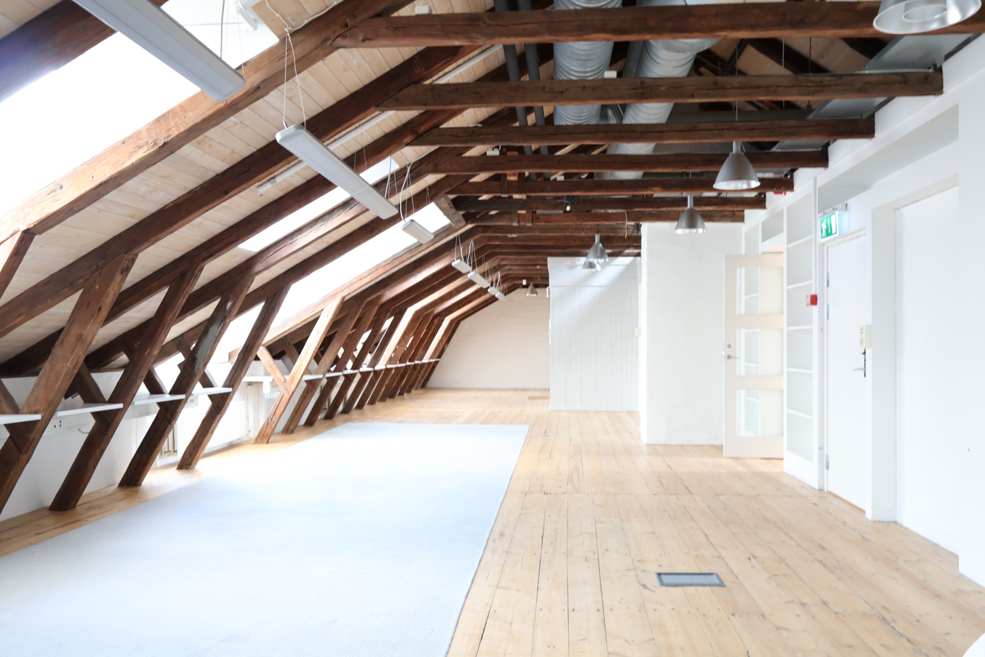 Redan vid första steget in möts du av synliga bjälkar i väggar och tak, brädgolv med naturlig patina och ett fantastiskt ljusinsläpp från takfönster. Den rustika känslan skapar en varm och välkomnande miljö som kombineras med moderna inslag och uppdaterad teknik – perfekt för det moderna kontoret som vill ha något utöver det vanliga.