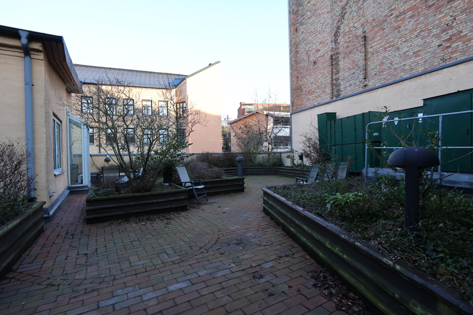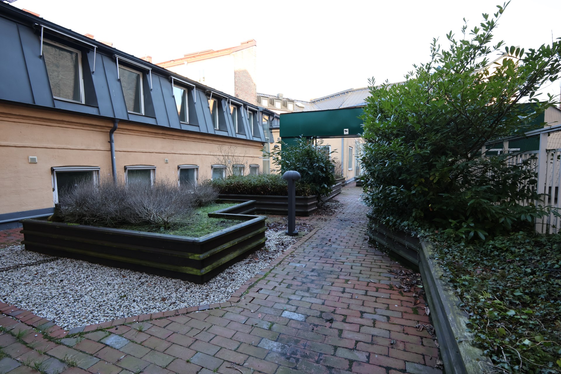 Fastigheten är utrustad med hiss för smidig tillgång, och i huset finns garage där parkeringsplatser kan hyras – en uppskattad bekvämlighet mitt i city. Som en rofylld kontrast till stadslivet öppnar sig en mysig innergård, en grön oas som bjuder in till pauser, informella möten eller en stunds återhämtning under arbetsdagen.