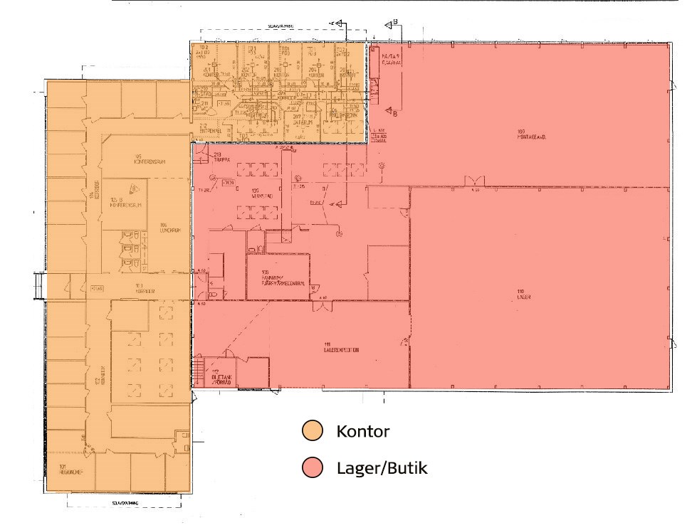 TA KONTAKTFastighetens ytor fördelar sig på en kontorsdel om ca 700 kvm och en lagerdel om ca 1 360 kvm . Kontorsdelen består idag av ett flertal kontorsrum, mötesrum samt generösa personalutrymme. Lagerdelen består av tre ytor med lastport och lastkaj. Takhöjden i lagret är ca 4,3 meter fritt under balk. Fastigheten har en gård som är delvis hårdgjord samt har en mindre lastkaj.