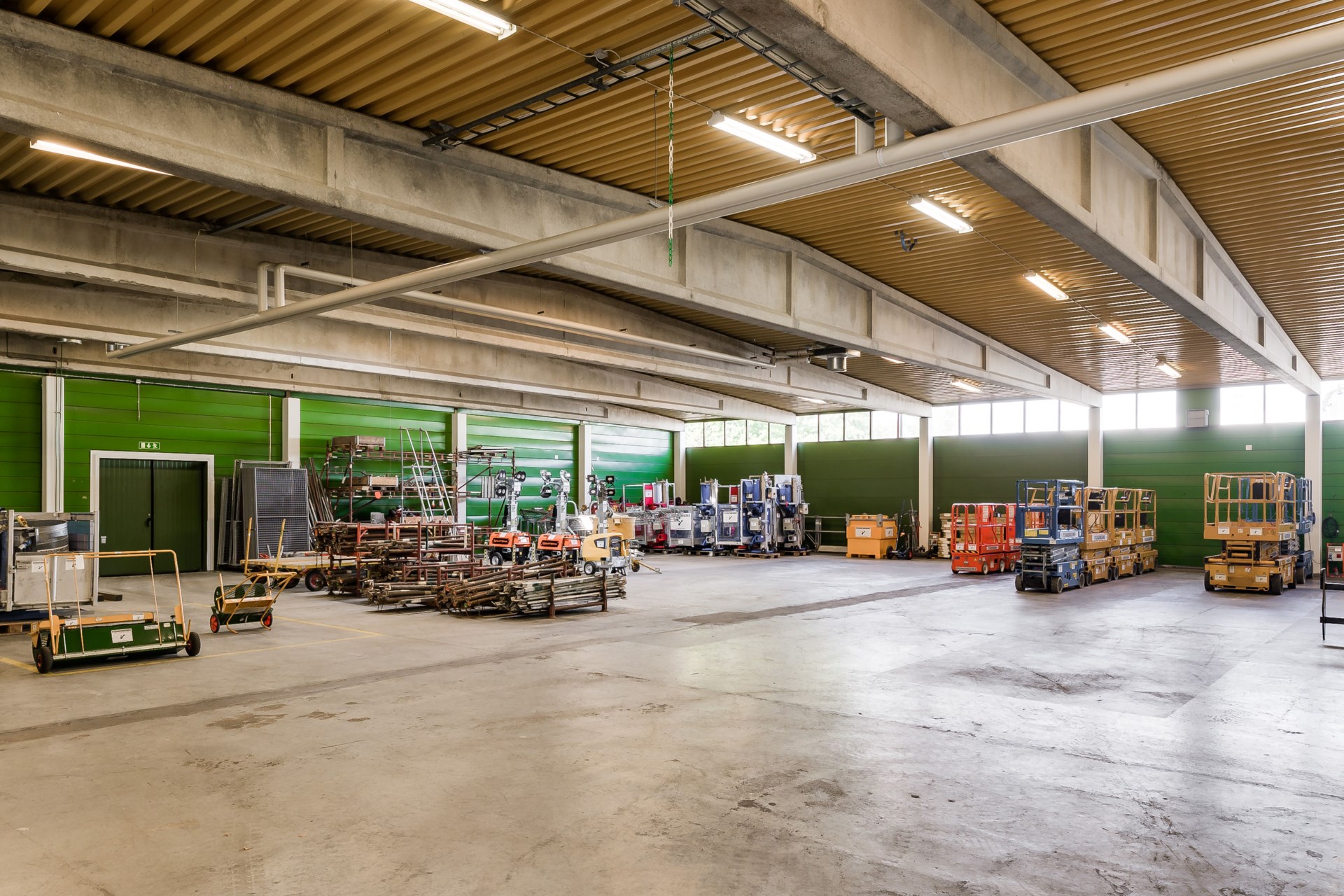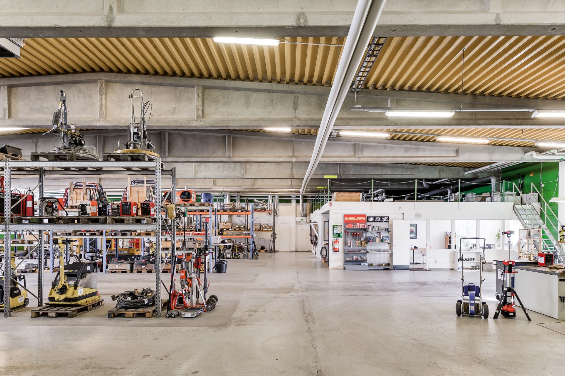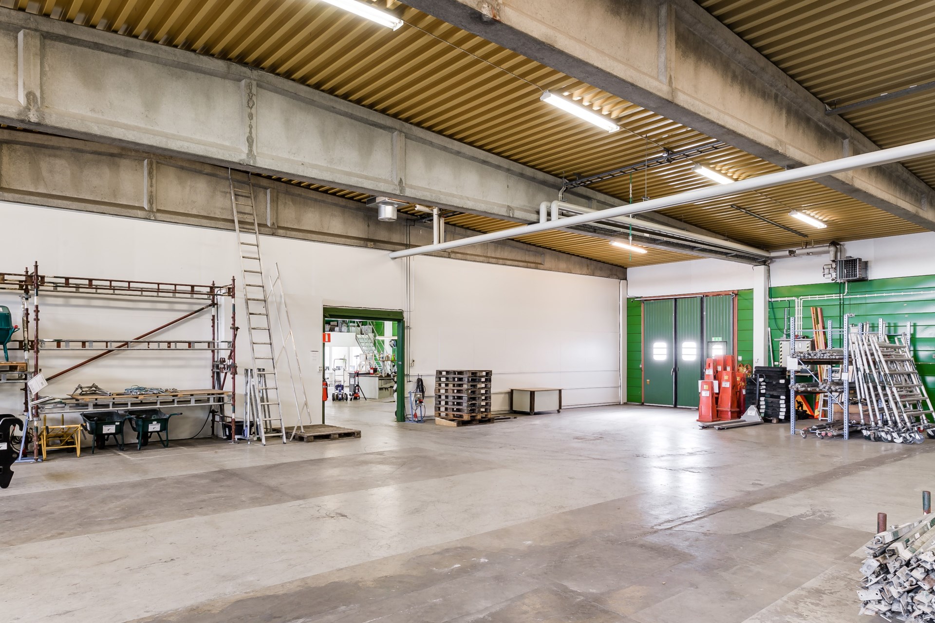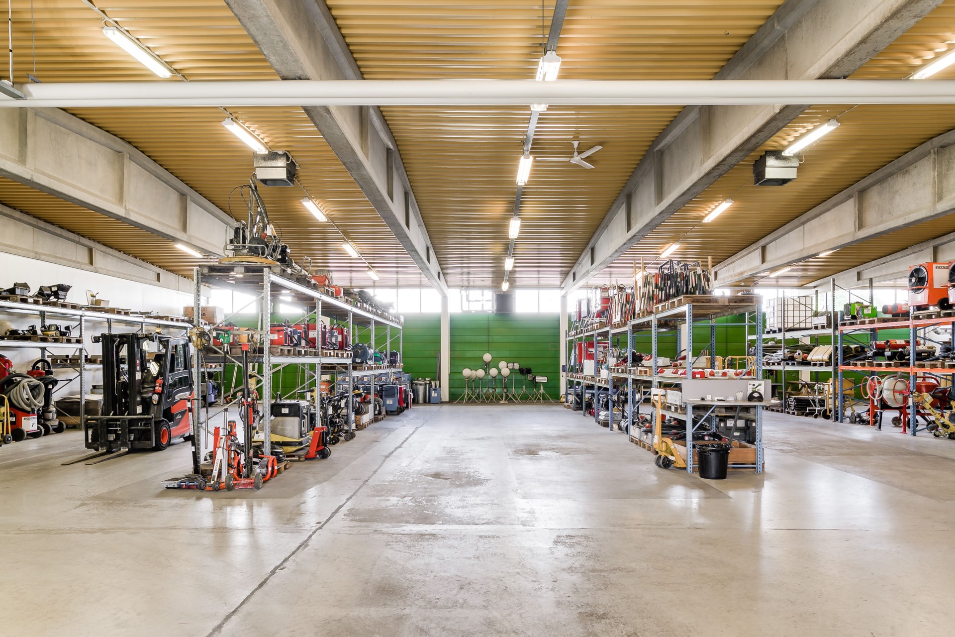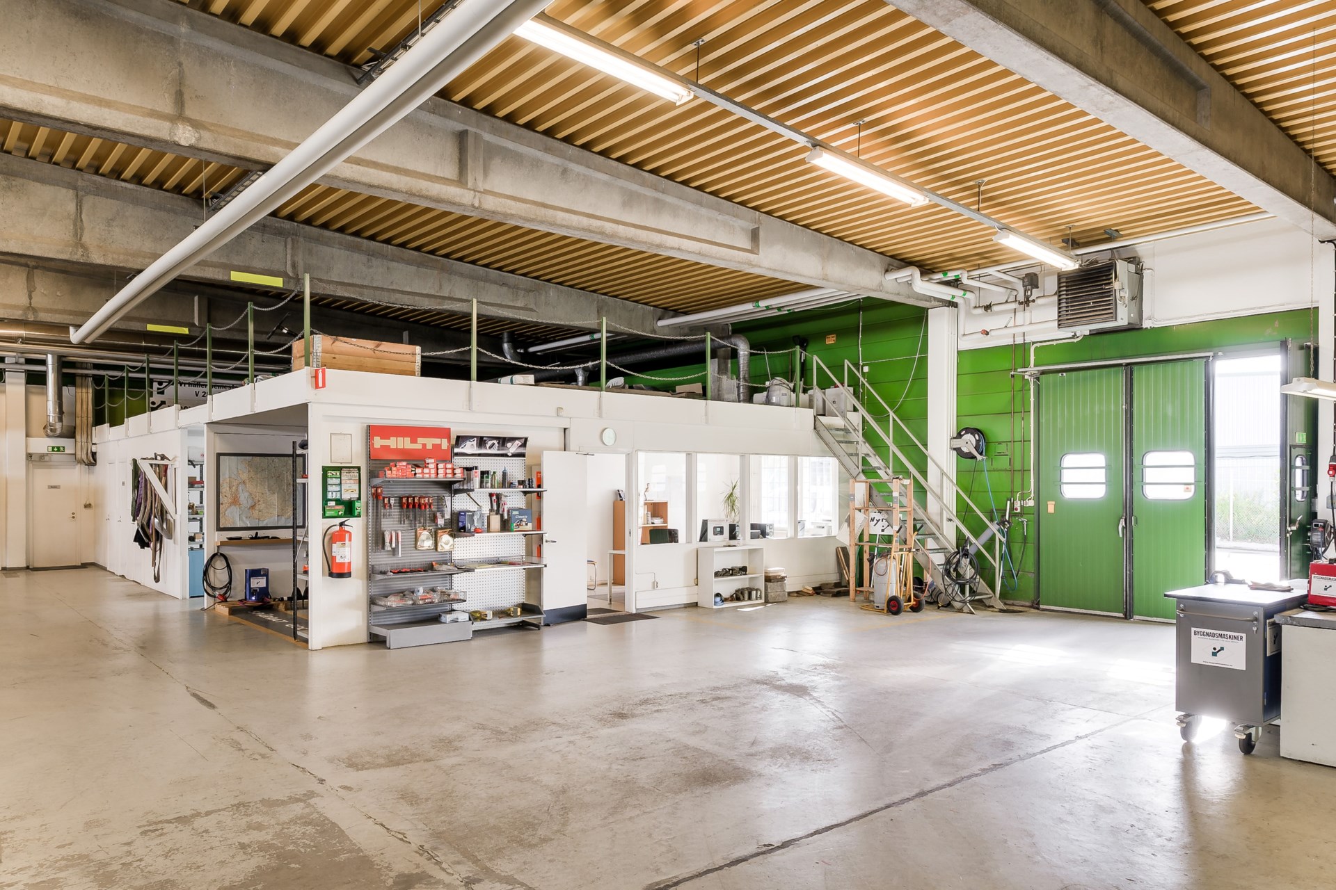 Lagerdelen omfattar cirka 1 580 kvm och är pelarfri med en takhöjd om cirka 4,2 meter till balk. Två vikportar (ca 3 x 3 m respektive 3 x 3,4 m) på byggnadens västra sida möjliggör smidig hantering av in- och utleveranser.